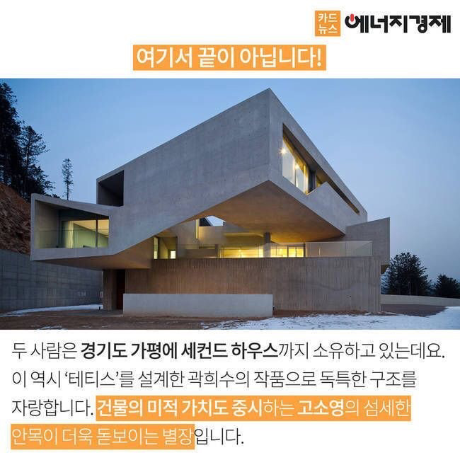가평의 세컨드하우스 별장은 세계 건축상 까지 수상했으며 고소영의 미적 감각이 드러나는 별장으로 화제가 되기도 했습니다.