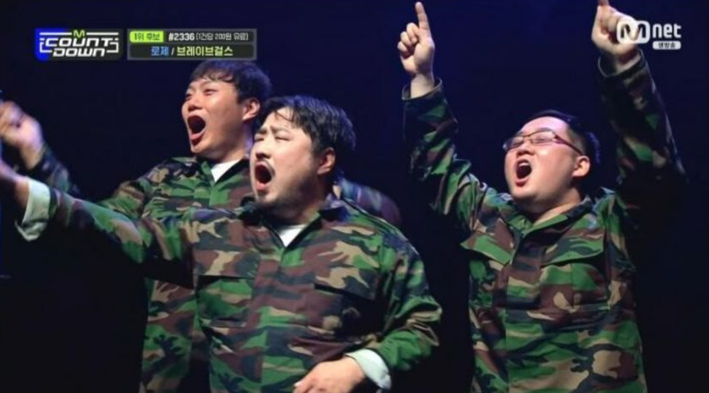 오늘자 브레이브걸스 엠카운트다운 무대는 시도는 좋았지만 혹평이 이어지고 있는데요. 이날 무대에는 강재준과 더불어 개그맨 설명근과 최우선도 함께 올라 브레이브걸스와 함께 무대를 꾸미며 그동안 브레이브걸스가 보여줬던 롤린 무대와 차별화된 재미와 볼거리를 제공할 것으로 기획했는데요. 개그맨 세 사람과 브레이브걸스의 조합이 유튜브에서 화제를 모았던 브레이브걸스와 해병대 장병들의 컬래버레이션을 연상케 했지만 쁘걸의 엔딩도 잡아주지 않고 개그맨들의 예비역 코스프레 밈화 되어 재미도 없고 별로라는 평이 주류입니다.