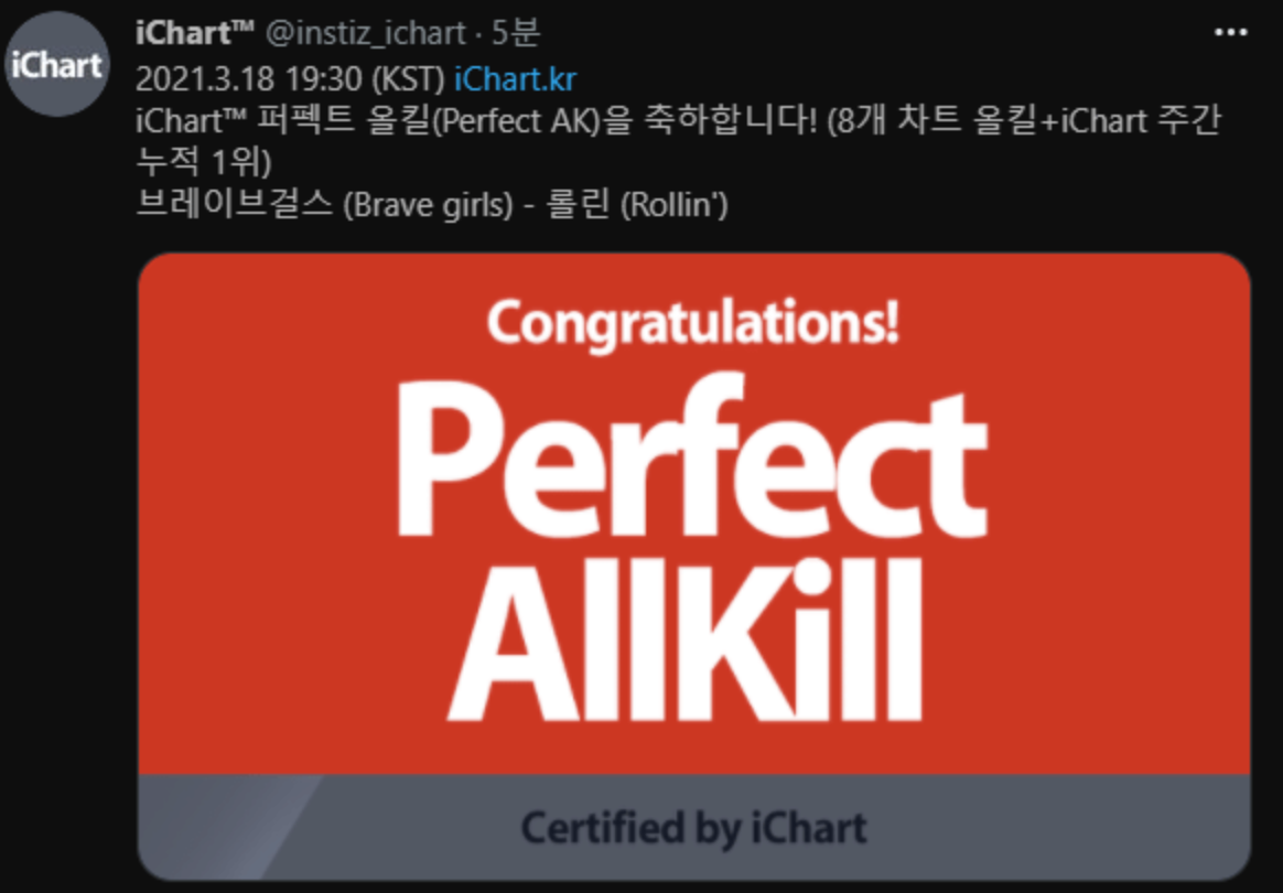 2021년 3월 18일 18:30분에 걸그룹 최초로 iChart PAK 100회를 달성했는데요. 이 시점에서 역대 PAK 횟수 순위는 11위였습니다.