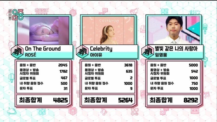 3월20일 방송된 MBC 쇼!음악중심 에서는 임영웅이 로제(on the ground), 아이유(Celebrity)를 제치고 높은 점수 차이로 1위를 차지했습니다.