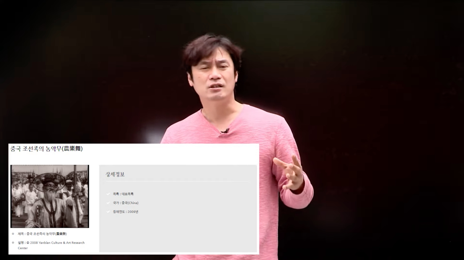 이어 조선 놀이패도 있는데 굳이 연변 사투리를 쓰는 놀이패가 꽤 오래 동안 등장하는데요. 이게 어떤 문제가 발생하냐면 중국이 최근 농악무를 조선족의 농악무라고 해서 인류무형문화유산으로 우리보다 먼저 등재시켰다고 합니다. 이건 동북공정의 일환으로 볼 수 있다라고 비판했습니다.