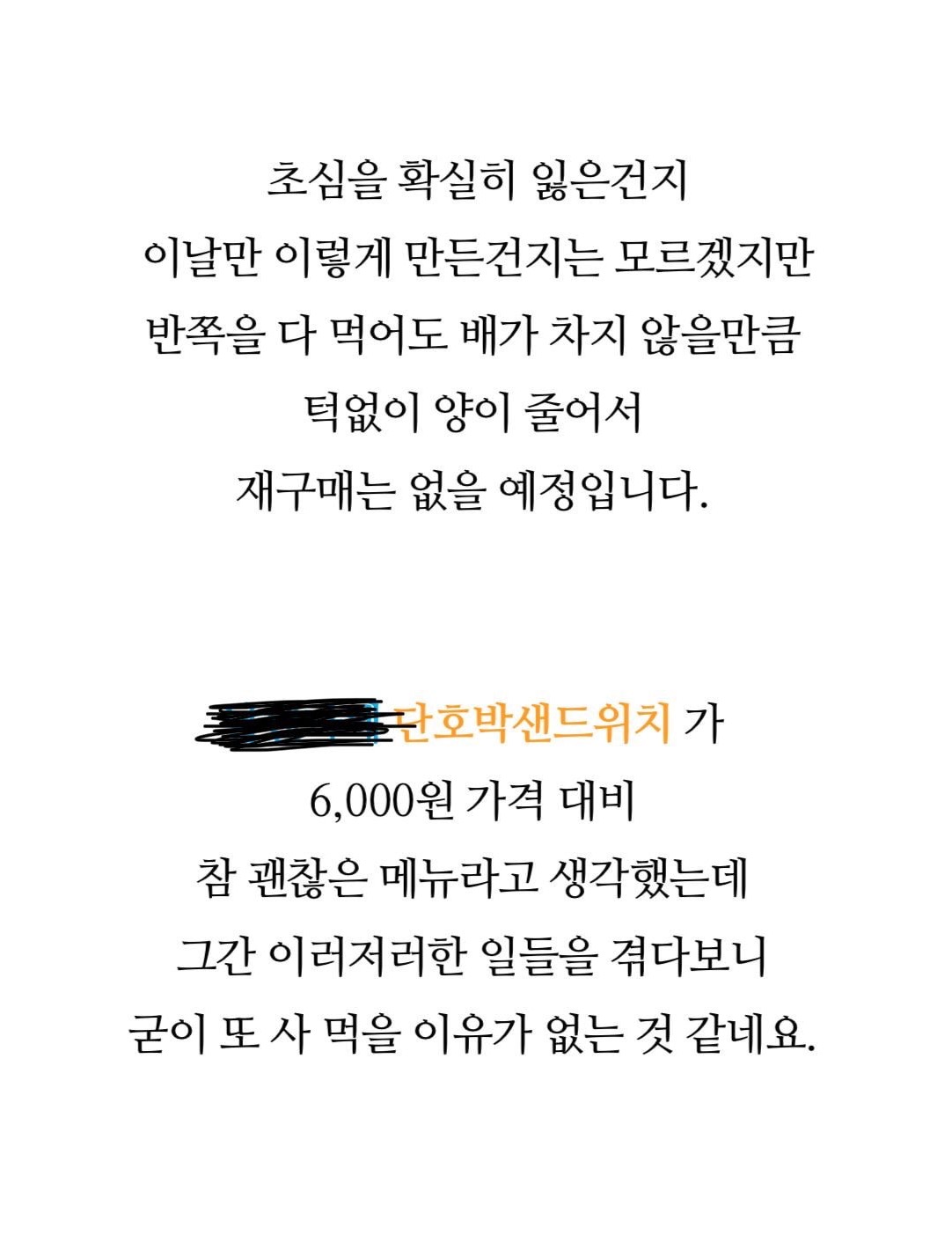 리뷰의 다른 샌드위치 상태들을 봐도 오늘도 맛있다 오히려 하나만 먹어도 배부르다는 후기만 있는 상황으로 내용물에 대한 불만도 다소 의문이 생기는 상황입니다.