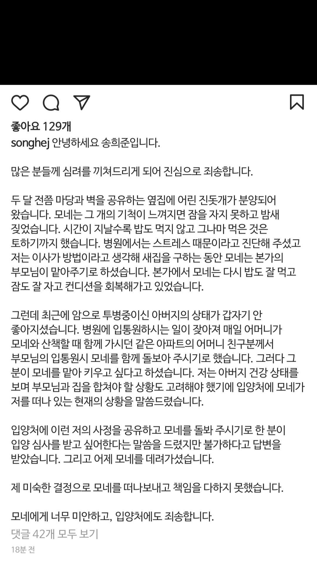 송희준은 3월 28일 자신의 인스타그램을 통해 지난 2020년 6월 입양한 반려견 모네를 입양처로 다시 보낼 수 밖에 없었던 이유에 대해서 해명했습니다.