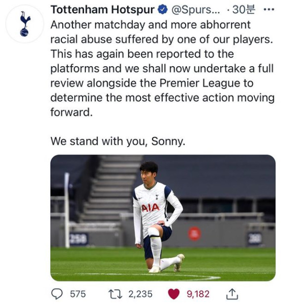 우리 선수들 중 한 명(손흥민)이 경기 종료 후 끔찍한 인종 차별을 당했다.우리는 여러 자료들을 수집하여 프리미어리그와 함께 효과적인 결정을 내릴 것이다.