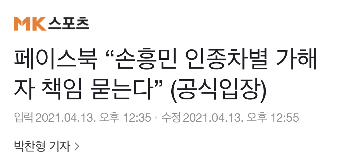 이에 페이스북 본사 측에서도 손흥민이 인종차별 학대를 받고 있다고 손흥민을 향한 인종차별 글은 즉시 삭제하고 책임 묻겠다고 공식 답변을 한 상태 입니다.