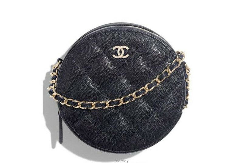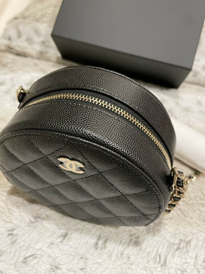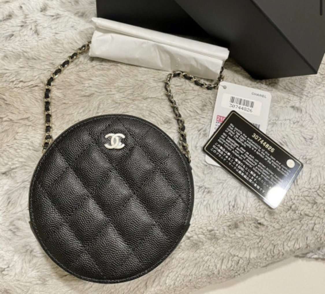 샤넬 라운드 원형 미니백 동그리백 캐비어 금장 블랙은2019년도 신상이고 구하기 어려운 레어템 인데요. 구성품은 더스트백+개런티카드+정품박스 이며 사이즈는 4.7 x 4.7 x 2.25 입니다.