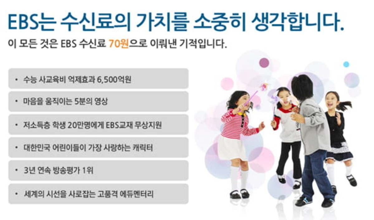 요즘 한창 수신료가 올라간다 반대한다 말들이 많은데 KBS가 국민들에게 받는 수신료는 2500원 그 수신료중 90%는 KBS가 먹고 6.6%는 한국전력, 그리고 2.8%를 EBS가 먹는 구조인데 2500원중 불과 70원만 EBS에 떨어지는 구조입니다.