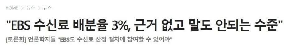 EBS는 현재 70원은 수십년전 기준이고 지금은 최소한 892원 정도가 합당하다고 주장하고 있고 EBS 뿐만 아니라 언론학자나 시민운동가들도 EBS가 고작 3% 배분받는건 문제다라고 지적하며 최소 7:3 이나 20~30%는 EBS가 가져가야 한다고 주장하고 있습니다. 그럼 도대체 3% 기준이 뭐고 왜 KBS 마음대로 정하는 이유는 그건 바로 EBS의 전신이 바로 KBS 3TV였기때문이라고 하네요. 본래 KBS 소속이다 1990년 독립해 오늘에 이르고 있는데 여전히 수신료 배분은 달라진게 없는 상황입니다.