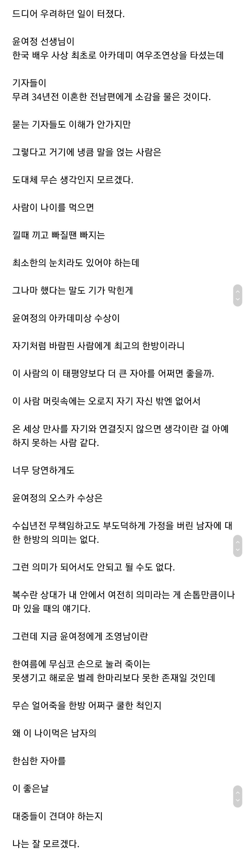 남들이 보기에 내가 윤여정을 언급하는 게 안 좋다고 하고, 부정적으로 보기도 해 조심스러운 것도 사실이라면서 나는 그냥 축하를 전하고 싶은 마음이라고 말했다고 하는데요.