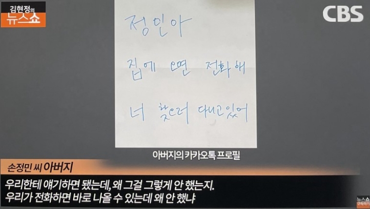 4월 25일 새벽 실종된 손정민(나이 22살)씨의 아버지는 지난 4월 28일 카카오톡 프로필 문장을 바꾸었습니다. 아들 눈에 잘 보이길 바라는 듯 흰 종이에 하늘색 펜으로 쓴 글 입니다. 손정민씨의 아버지는 한강 주변을 돌리며 현수막과 전단으로 아들의 흔적을 찾고 있는데요. 인근 아파트에까지 전단을 붙였습니다. 아들의 행방이나 25일 새벽 목격자를 찾기 위해서 입니다. 지금까지 아파트 게시판 등에 붙인 전단은 1000장이 넘고 집을 비운 사이 아들이 돌아올 수도 있어 프로필을 바꾸었다고 합니다.
