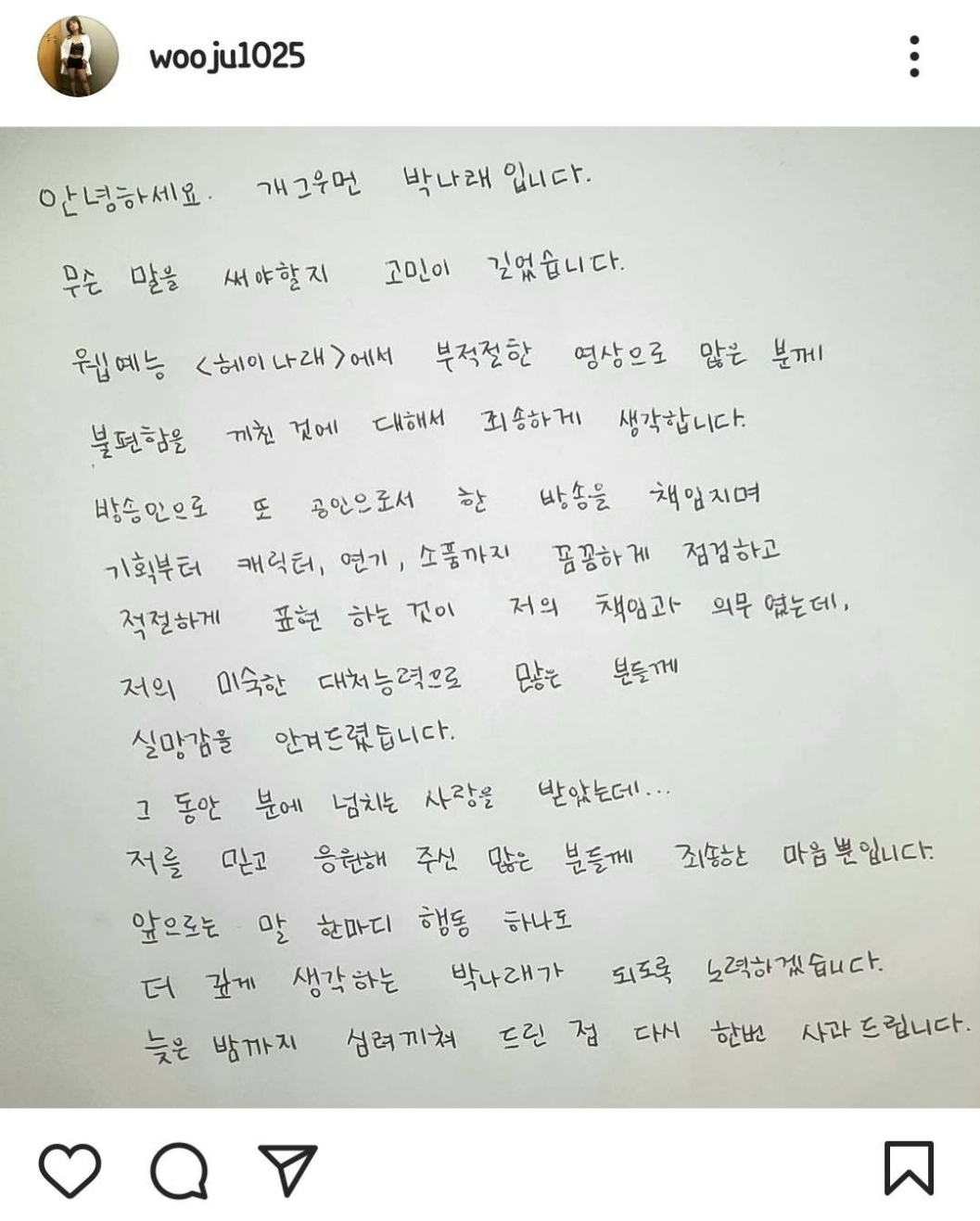 제작진은 급히 영상을 비공개 처리하고 공식적으로 사과했으며 박나래도 인스타를 통해서 자필 사과문을 냈습니다.