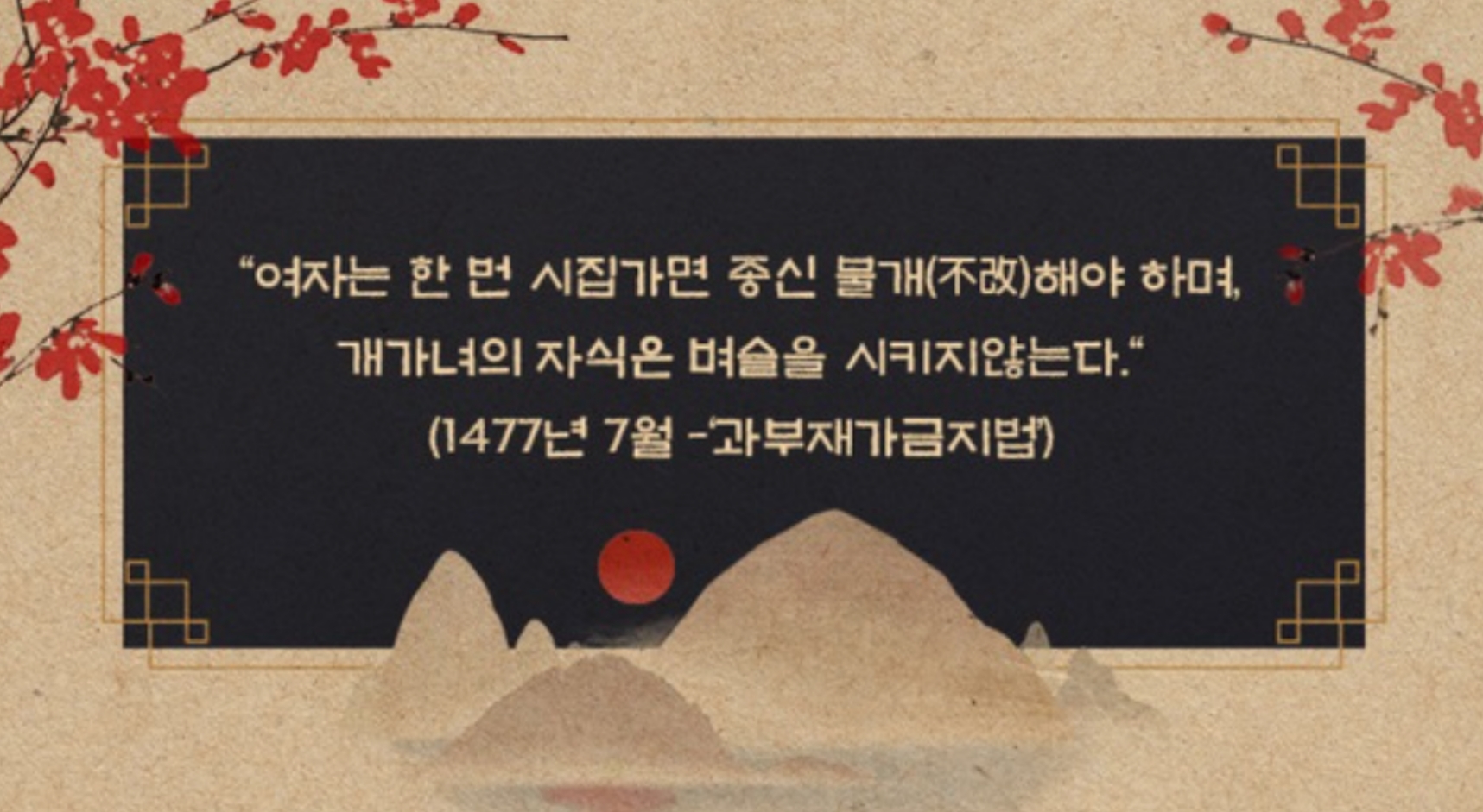 여자는 한 번 시집가면 종신 불개(不改)해야 하며, 개가녀의 자식은 벼슬을 시키지않는다. 1477년 7월 - 과부재가금지법