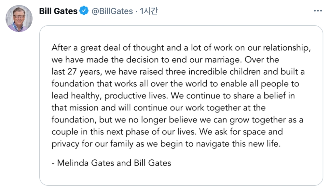 마이크로 소프트의 공동 창립자이자 전 CEO 빌 게이츠는 현지시간으로 3일 EST 오후 4시30분 트위터를 통해 자신과 아내 멀린다 게이츠가 결혼 27년 만에 헤어질 것이라는 공동성명을 발표했습니다.