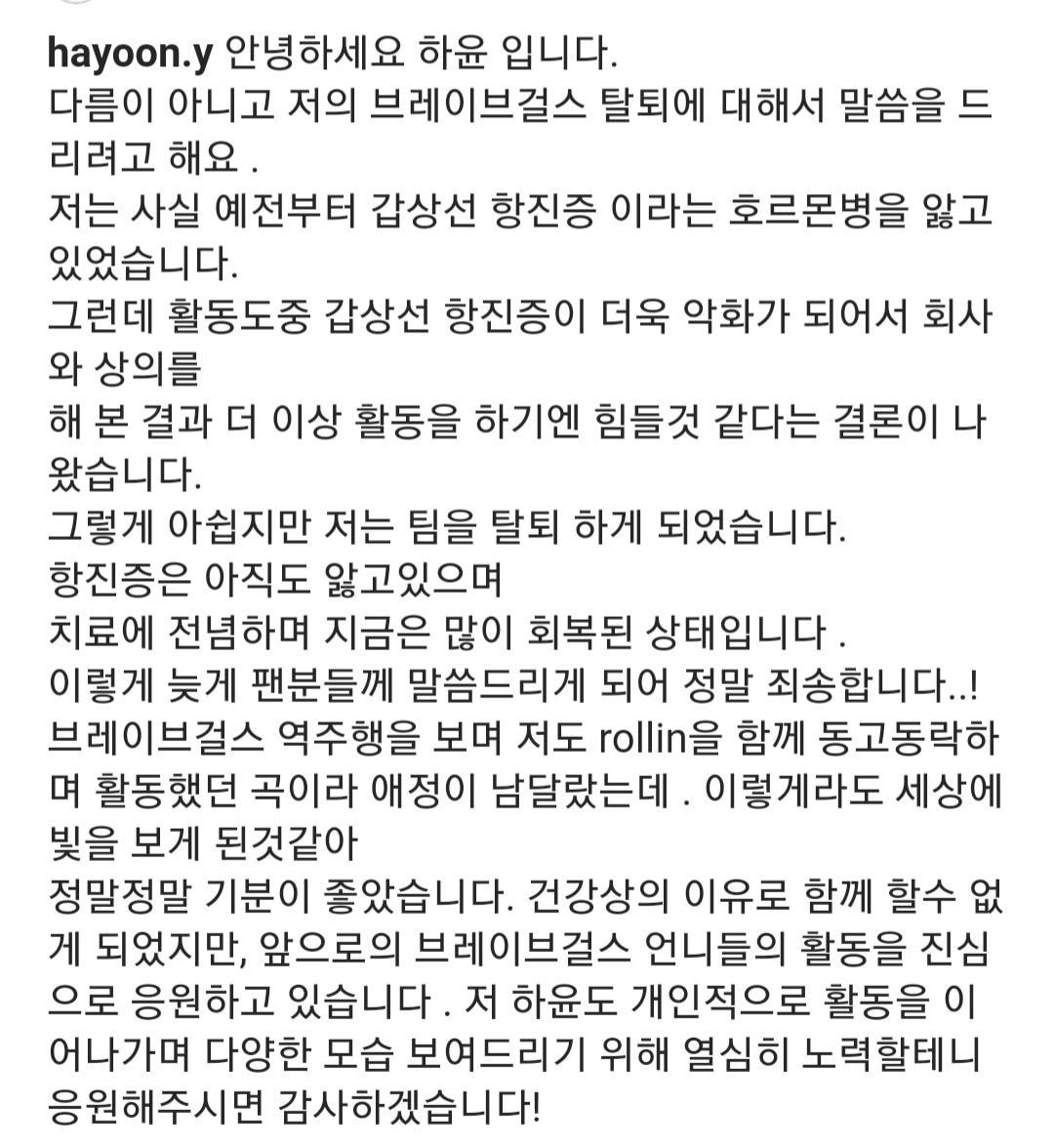 안녕하세요 하윤입니다. 다름이 아니고 저의 브레이브걸스 탈퇴에 대해서 말씀을 드리려고 해요라며 저는 사실 예전부터 갑상선 항진증이라는 호르몬병을 앓고 있었습니다라고 밝히며 건강상의 이유로 탈퇴를 했다고 전해왔습니다.