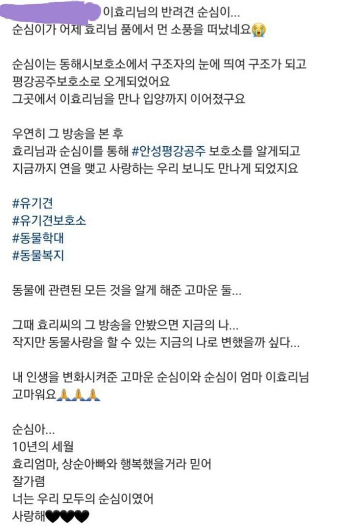 안성 평강공주보호소는 공식 SNS를 통해 이효리님께 소식이 왔다면서 2010년 효리님의 가족이 되었던 순심이가 하늘의 별이 되었다라며 이효리의 반려견 순심이의 소식을 전했는데요. 평강공주보호소는 이효리가 순심이를 입양하기 전 순심이를 돌봤던 곳으로 이효리는 순심이를 입양한 뒤에 안성보호소 카페를 통해 소식을 전했었습니다. 2011년 이효리는 촬영을 핑계 삼아 순심이를 데려 오게 되었는데 건강검진을 하고 미용을 하니 한쪽 눈이 누군가의 공격에 의해 실명 되어 있었고 자궁 축농증이 심해 바로 수술을 받아야 할정도로 상태가 좋지 않았었는데요. 결국 순심이는 촬영에서 제외 되었고 2주간 입원을 하게 되었습니다. 이효리의 집으로 데려오니 매일 잠만 잤다라고 전하기도 했었습니다.