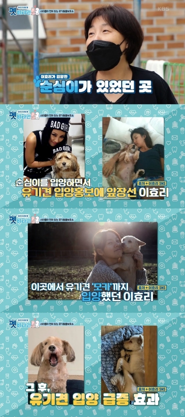 KBS 2TV 예능 펫 비타민 5회에서는 이효리가 반려견 순심이, 모카를 입양했다는 유기견 보호소의 소장님이 등장하며 이 보호소에서 이효리가 대중에게 많이 알려진 반려견 순심이를 입양해 갔다고 전했는데요. 당시 이효리는 보호소 봉사 중 운명적으로 순심이와 모카를 만나 입양했으며 그후 유기견 홍보에 쭉 앞장서며 좋은 반향을 불러일으킨 바 있는데요. 실제 이효리의 순심이 모카 입양 후에는 유기견 입양이 급증해 이효리의 선한 영향력을 선보이기도 했습니다.