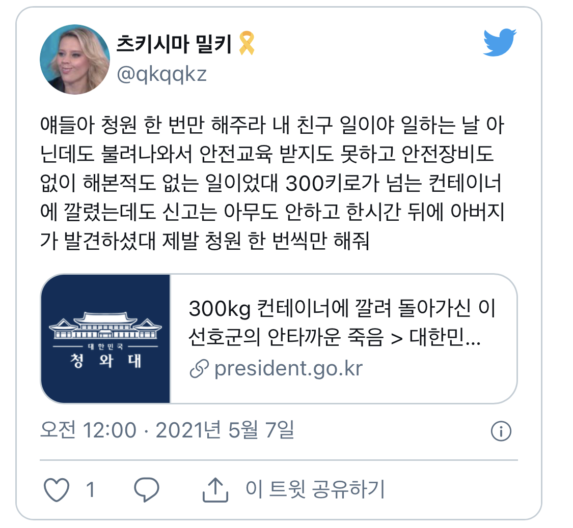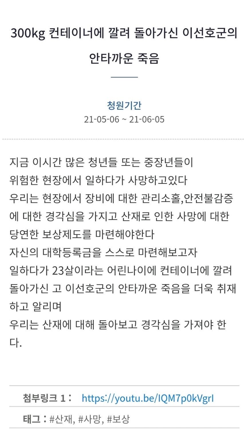 300kg 컨테이너에 깔려 돌아가신 이선호군의 안타까운 죽음 > 대한민국 청와대