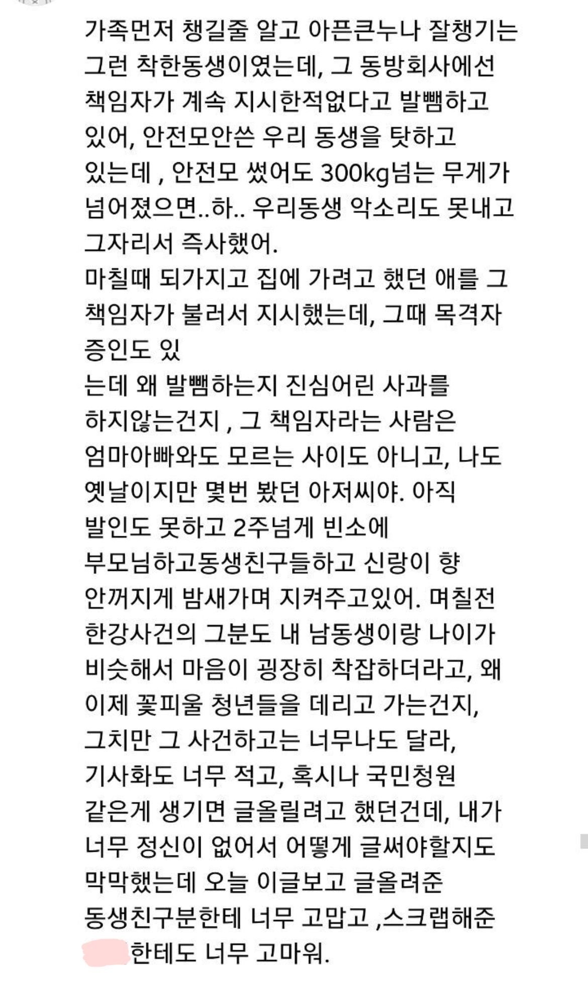해당 작업에 대해 아무런 경험이 없는 친구에게 어떠한 안전교육도 없이, 수신호자 없이, 명백하게 위험한 구조물에 들어가 하지 않아도 될 일을 지시했습니다. 그 위험한 구조물은 불량이었고 결국 300kg의 무게가 친구를 덮쳤습니다.