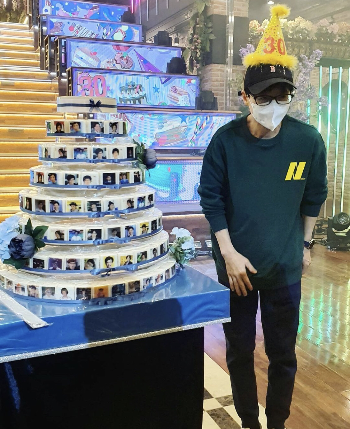 사진 속에는 거대한 떡케이크 앞에서 두 손을 모으고 수줍게 웃고 있는 유재석의 모습이 담겨있고 노란색 고깔 모자를 쓴 유재석이 민망해 하며 인사하는 모습이 보이네요ㅋㅋㅋ 30주년 축하합니다!!