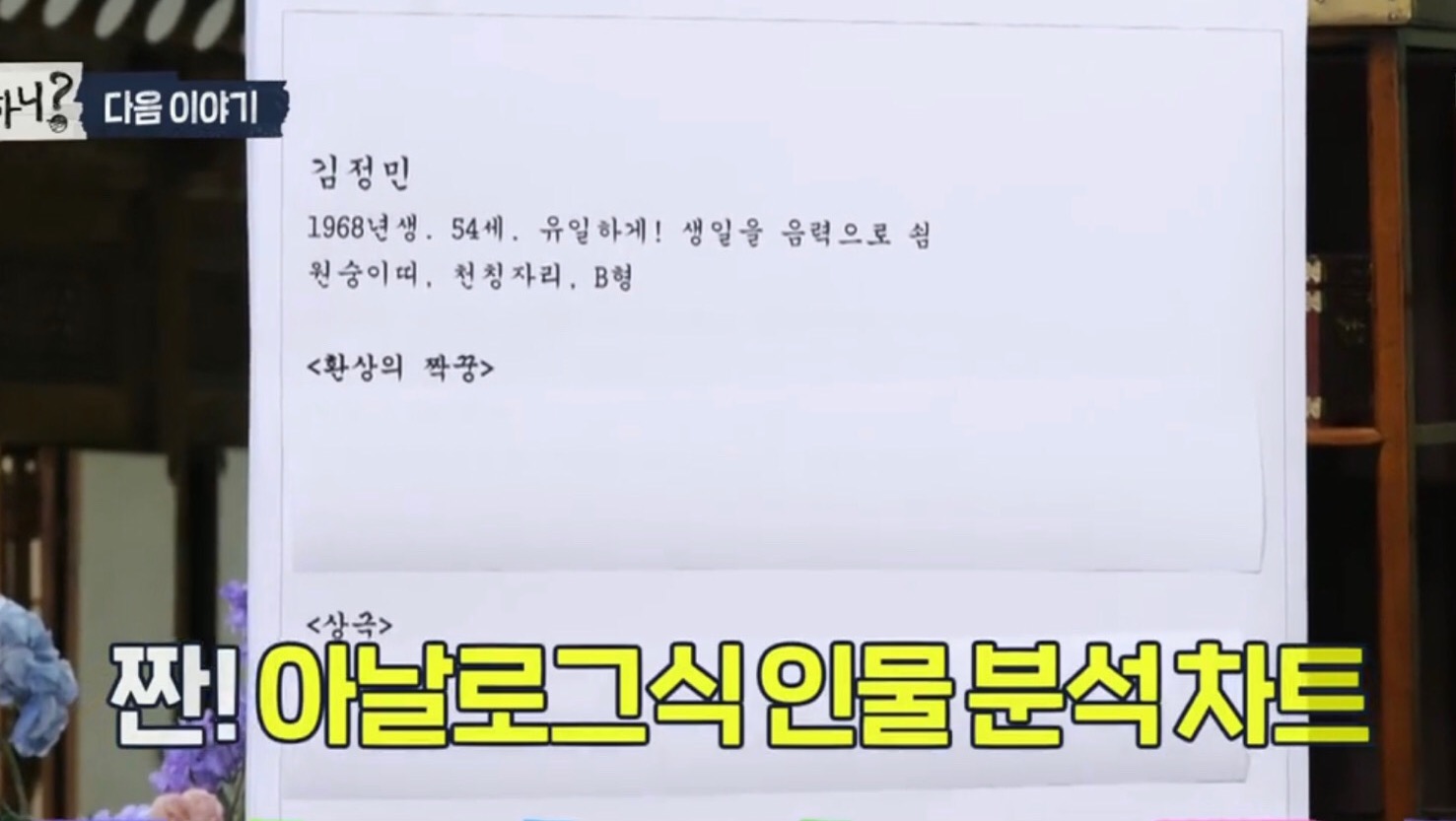 지석진, 김정민 등 80년대생(KCM,쌈디,이동휘)까지는 유야호가 준비한 차트를 보고 반가움을 드러내지만90년대생들은 아날로그식 분석 차트를 보고 어리둥절한 반응을 보입니다ㅋㅋ