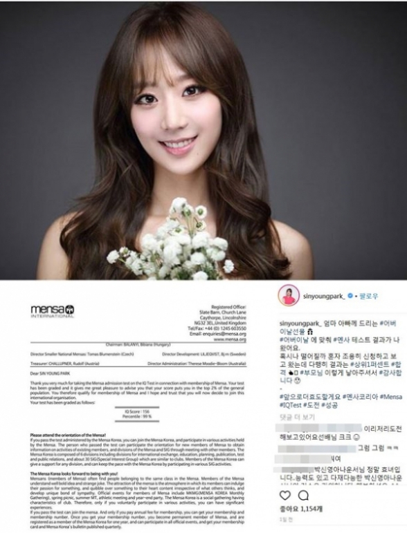 2018년 5월 8일, 멘사 테스트에 합격했다는 소식을 전했는데요. 그냥 합격도 아니고 무려 상위 1% 합격자라고 밝혔습니다. 본인이 말하기를 이 합격 소식은 부모에게 드리는 어버이날 선물이라고 말했으며 본인의 아이큐는 156이상으로 박경과 똑같으며 남동생 역시 멘사 회원으로 활동하고 있습니다.