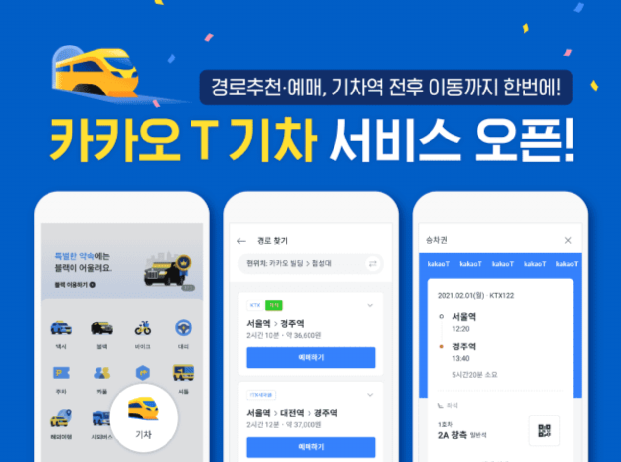 카카오 T 기차 서비스는 한국철도에서 운영하는 모든 종류의 일반 열차에 대해 예매부터 결제, 발권까지 전 과정이 가능하고, 카카오 T 시외버스, 카카오 T 택시 등의 서비스까지 유기적으로 연동해 범 광역권 이동 수단을 모두 아우르는 MaaS(Mobility as a Service)형 서비스를 제공하기에 이르렀습니다.