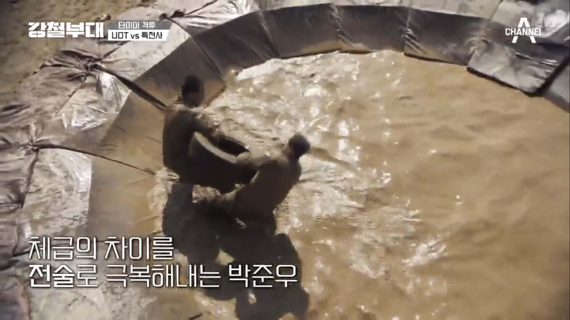 먼저 특전사가 참호격투 대장전 제1경기 승리 부대로 결정 되었는데욬 지난 주 특전사 전원과 SSU 황충원이 4대 1로 대치를 이룬 가운데, 특전사 정태균과 박도현, 김현동이 합세해 SSU 황충원의 하체를 들어 올리며 탈락시켰습니다. 적재적소의 공격과 방어 기술을 활용한 특전사는 대장 박준우의 리더십과 최상의 팀워크를 바탕으로 격전을 성공적으로 마무리 하며 승리를 가뒀습니다.