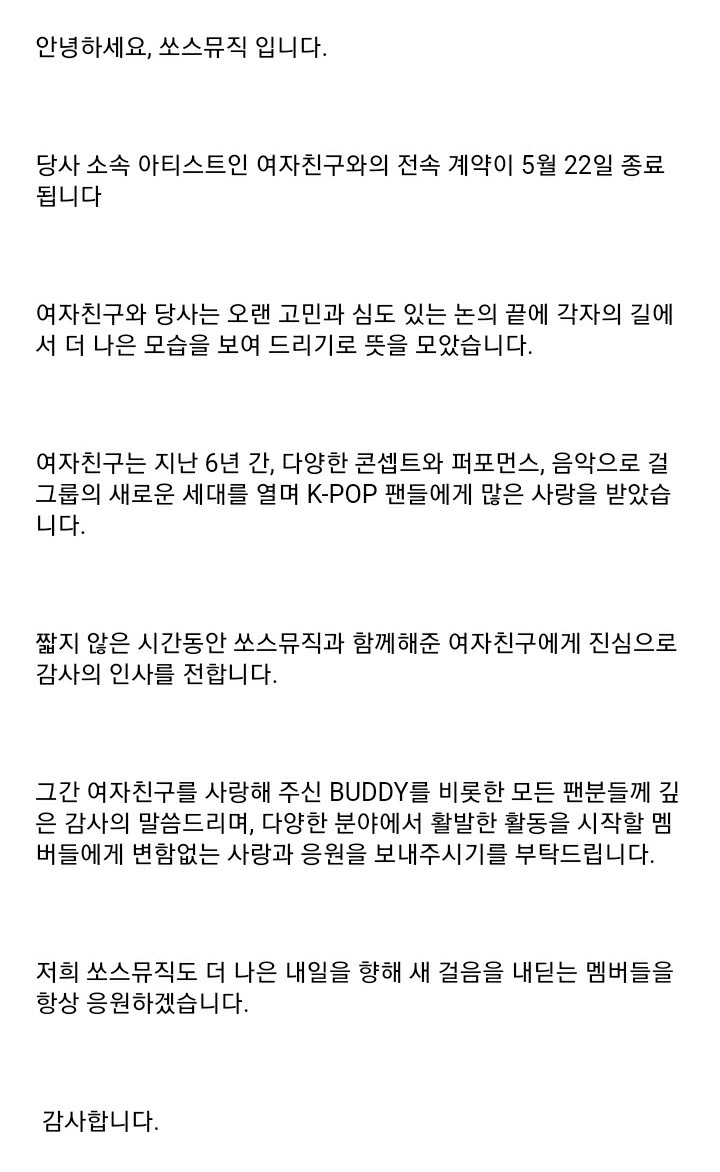 쏘스뮤직 측은 여자친구와 당사는 오랜 고민과 심도 있는 논의 끝에 각자의 길에서 더 나은 모습을 보여 드리기로 뜻을 모았다며 여자친구는 지난 6년간 다양한 콘셉트와 퍼포먼스, 음악으로 걸그룹의 새로운 세대를 열며 K-POP 팬들에게 많은 사랑을 받았다. 짧지 않은 시간 동안 쏘스뮤직과 함께해준 여자친구에게 진심으로 감사의 인사를 전한다고 밝혔습니다.