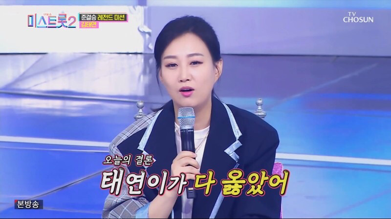 마스터 장윤정과 조영수 역시 극찬을 이어갔고 원곡자인 장윤정은 선곡에 어려움이 있었고 감정표현을 할 수있을까 걱정했는데 결국에는 태연이가 다 옳았다며 제가 한 수 배웠다. 지금 보니까 네가 다 옳아~라고 말하며 최고의 극찬을 받기도 했습니다.