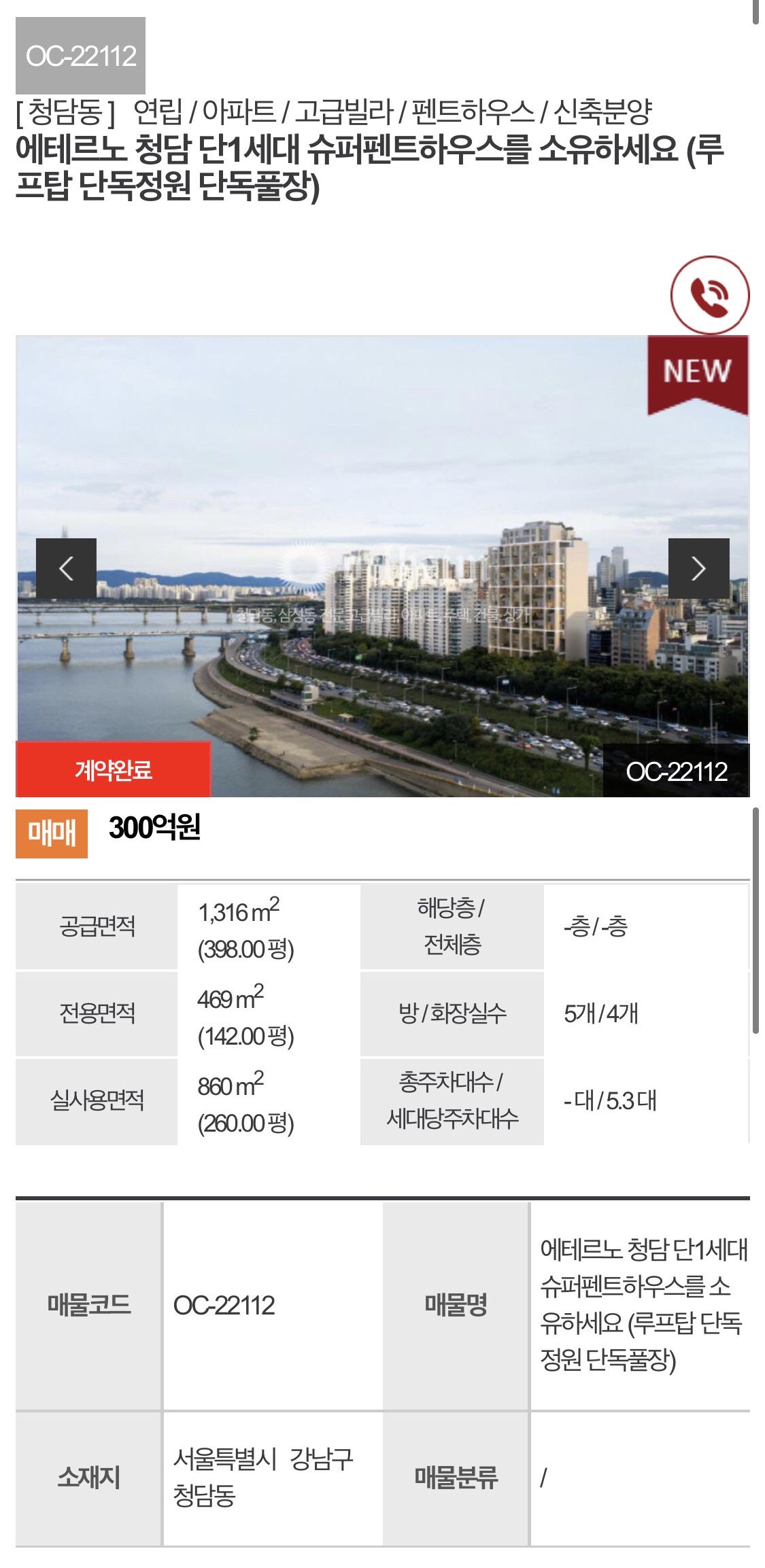 에테르노 청담 의 단1세대인 복층 슈퍼펜트하우스 입니다. (구)ONE H 풀복층구조, 단독 루프탑 풀장등 국내 최고의 펜트하우스로 슈퍼펜트 아래층 일반펜트2세대는 분양 완료되었습니다.