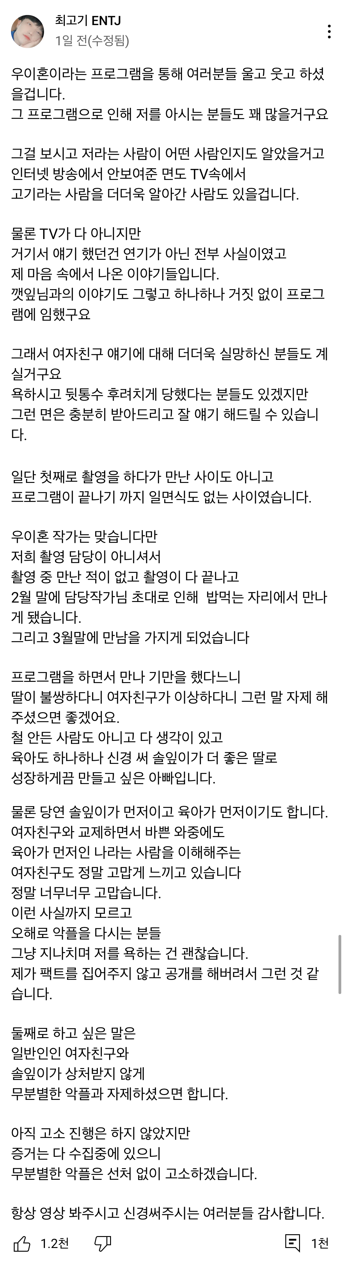 최고기는 6월 2일 자신의 유튜브 채널 커뮤니티에 장문의 입장글을 올렸는데요. 최고기는 우이혼 작가는 맞습니다만, 저희 촬영 담당이 아니셔서 촬영 중 만난 적이 없다며 촬영이 다 끝나고 2월 말에 담당작가님 초대로 인해 밥먹는 자리에서 만나게 되었으며 3월말에 만남을 가졌다고 전했습니다.