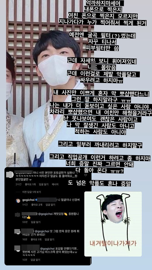 그러면서 일반인인 여자친구와 솔잎이가 상처받지 않게 무분별한 악플은 자제해달라며 증거는 다 수집중에 있으니 무분별한 악플은 선처 없이 고소하겠다고 예고 하기도 했습니다.