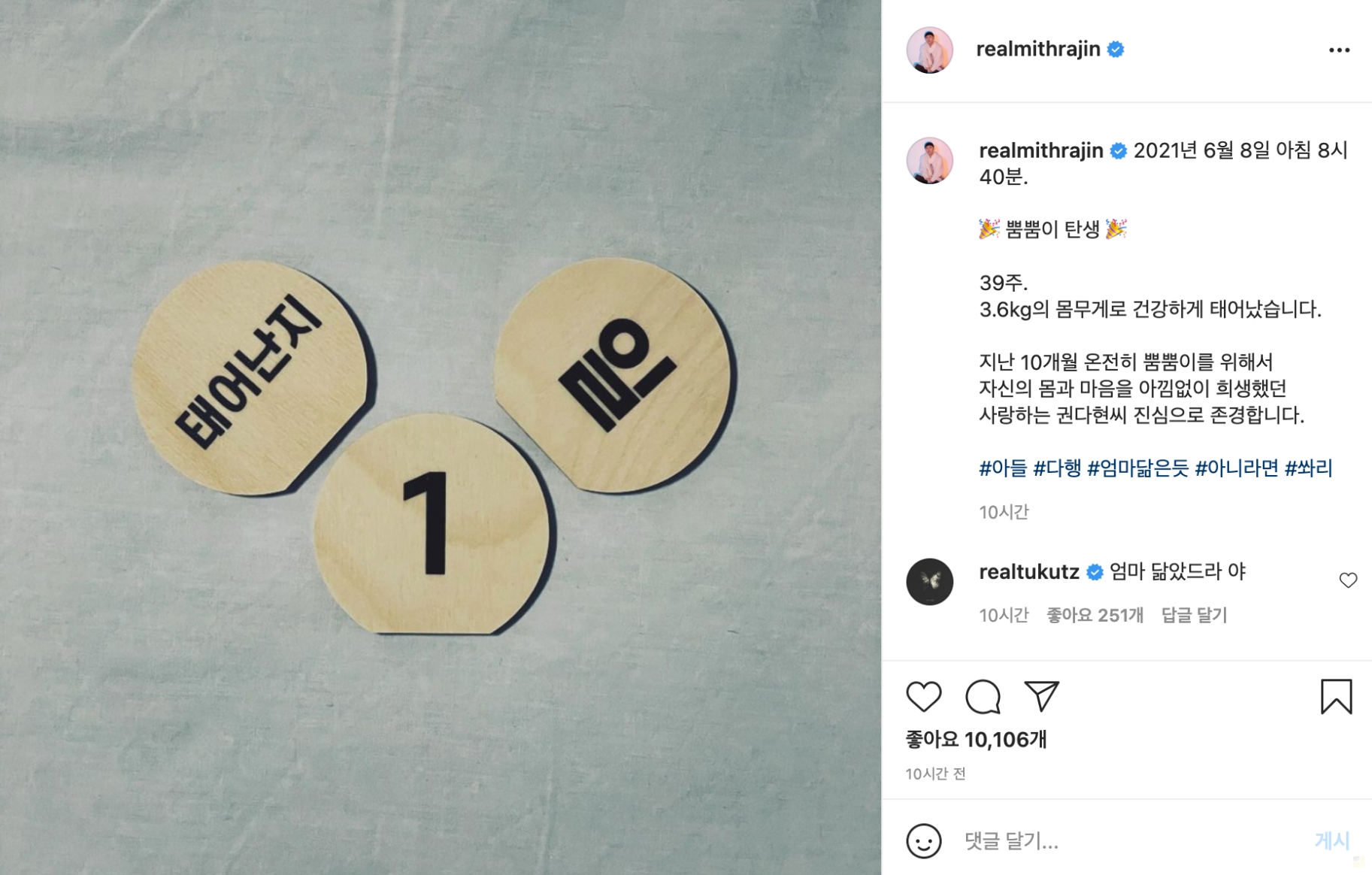 6월 9일 에픽하이 소속사 아워즈는 미쓰라가 6월 8일 오전 첫째를 득남 했고 산모와 아이 모두 건강한 상태 라고 밝혀왔습니다. 미쓰라 역시 지난 8일 자신의 공식 인스타그램 계정을 통해 2021년 6월 8일 오전 8시 40분. 뿜뿜이 탄생 이라는 게시글을 게재하며 득남 소식을 알렸습니다.