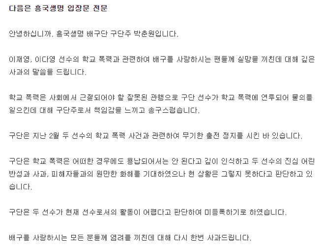 흥국생명 입장문 전문