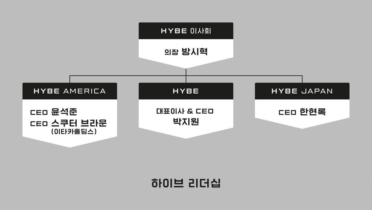윤석준 CEO와 스쿠터 브라운 CEO가 각각의 체제로 운영하며 스쿠터 브라운은 지난 4월 하이브가 약 1조 원에 인수한 미국 종합 미디어 기업 이타카 홀딩스의 설립자로 회사 합병 후 하이브 이사회에 합류 했습니다. 스쿠터 브라운은 기존 이타카 홀딩스 사업을 이끄는 동시에 하이브의 미국 사업 전반의 운영을 이끌어 갑니다.