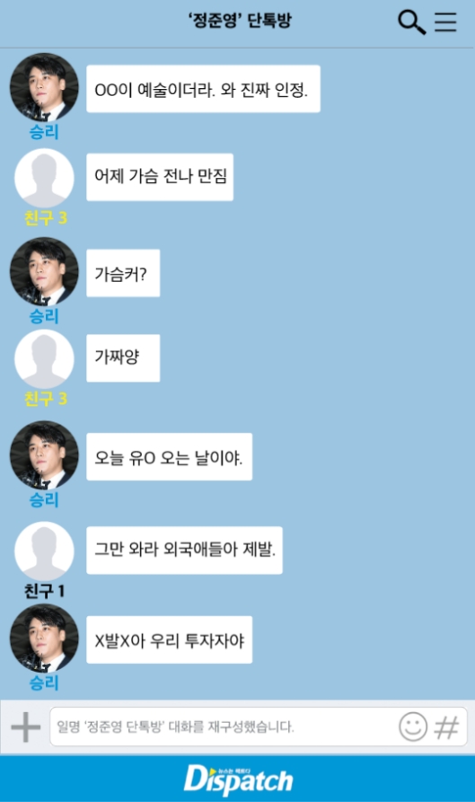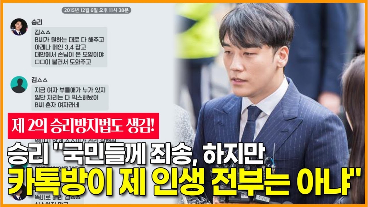 승리는 카톡방이 친구들끼리만 있던 거라 부적절한 언행도 오고 갔다. 그게 공개될 줄은 몰랐는데, 국민들께 송구하다 전했고 과장되고 허황된 이야기가 많이 나왔지만 카톡방이 전부는 아니라면서도 공개된 내용들에 대해 죄송하고 사죄드리고 싶다. 큰 사랑 받은 입장에서 국민들께 송구하고 부끄럽고 한심하고 죄송하다고 전했습니다.