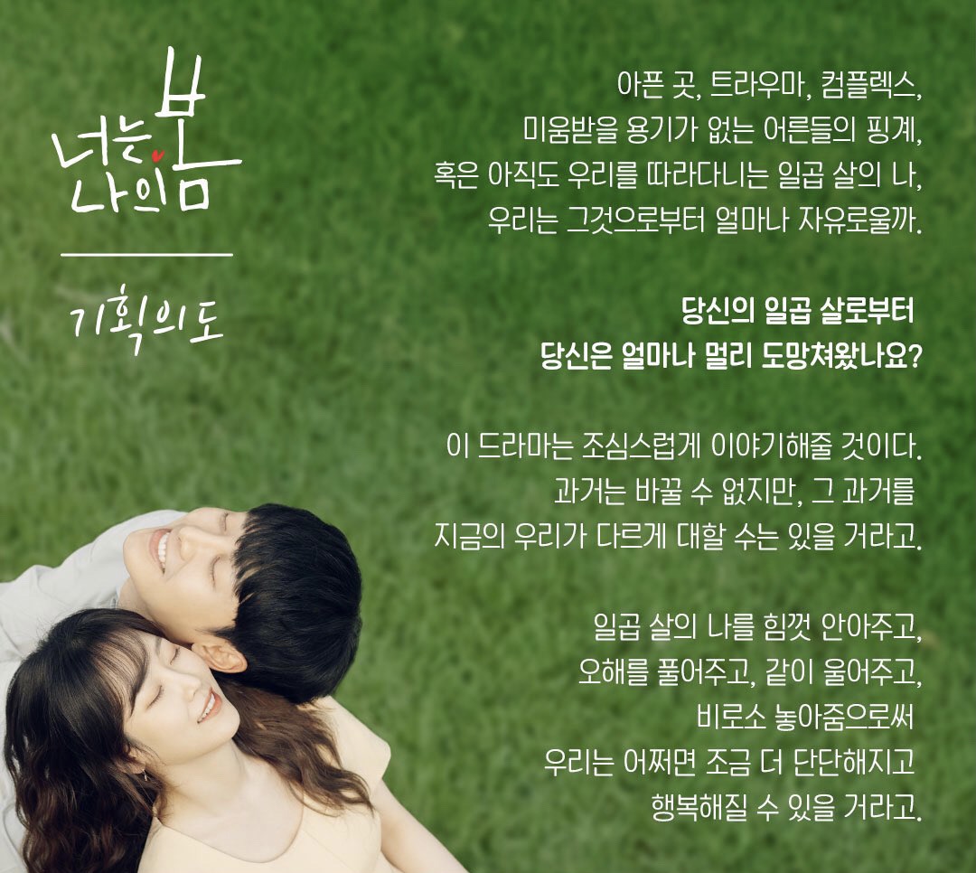 극본을 쓴 이미나 작가가 작사한 성시경의 노래 너는 나의 봄이다 노래에서 드라마 제목도 유래된 것으로 보이는데요. 남자주인공인 주영도 역에 윤계상이 출연할 예정이었으나 스케줄 상의 문제로 하차했고 후에 김동욱이 출연하게 되었다고 하네요.