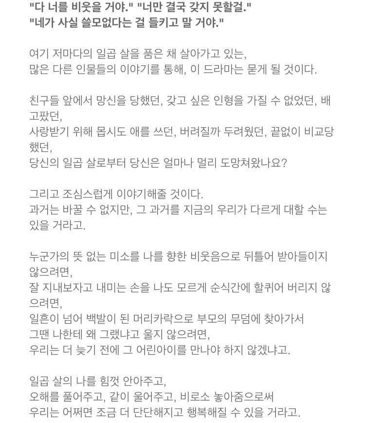 이드라마는조심스럽게이야기해줄것이다.과거는바꿀수없지만,그과거를지금의우리가다르게대할수는있을거라고.
