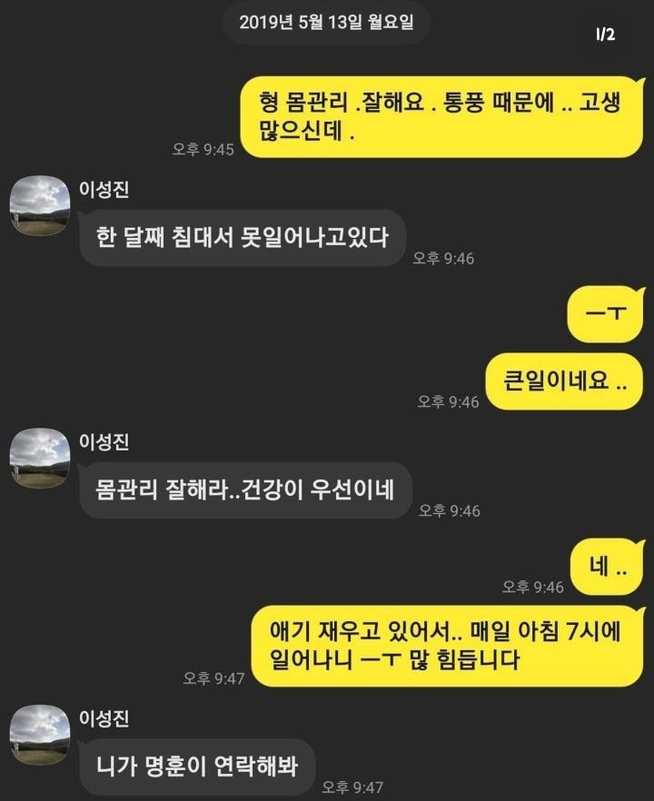 노유민은 9일 오전 자신의 인스타그램을 통해 2018년부터 성진이형이 따돌림 (왕따) 당했다고 주장을 하시는데 과연 이것이 따돌림을 받는 사람과의 대화 내용이라고 생각하시나요? 라며 사진을 공개했습니다.