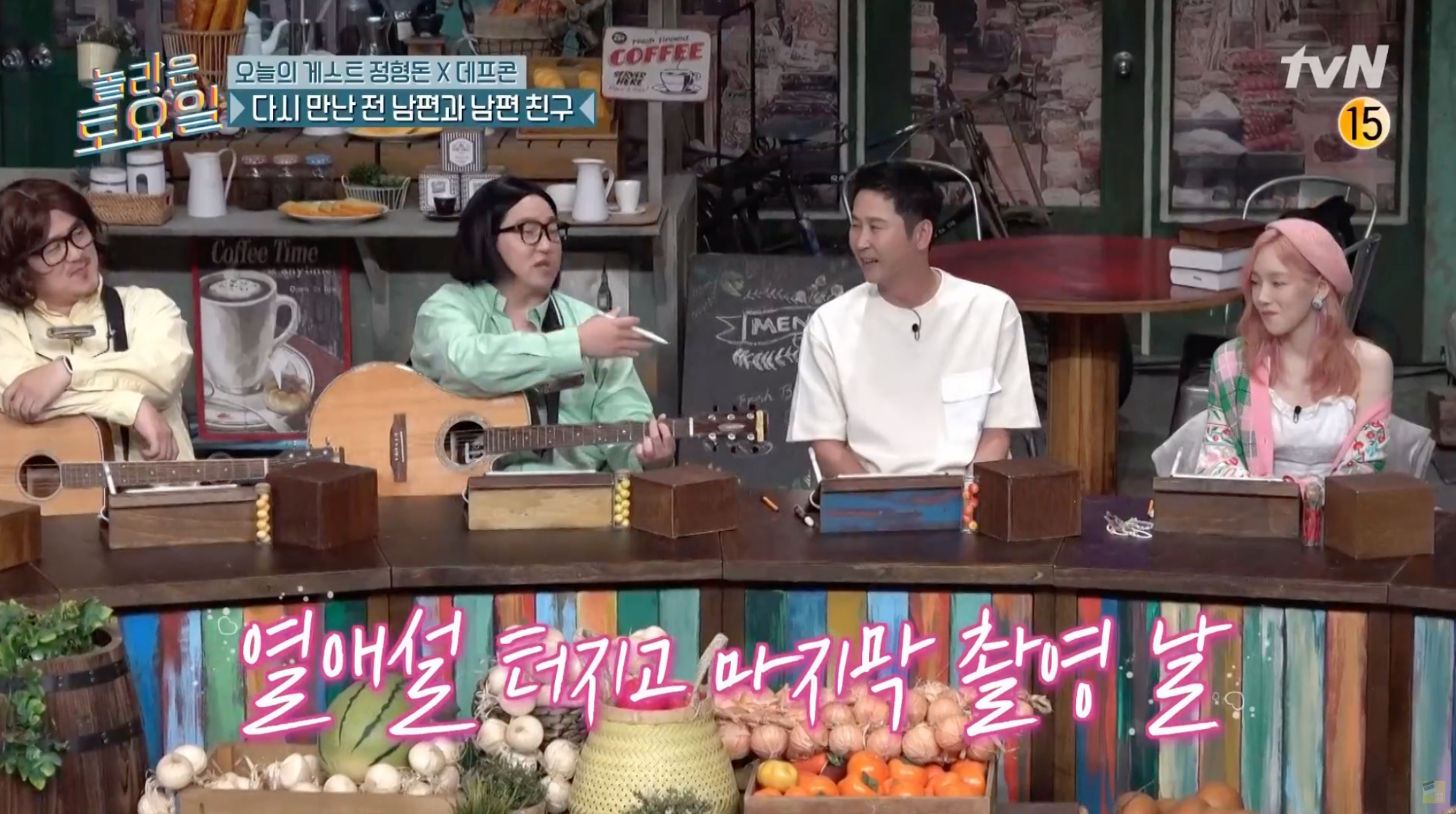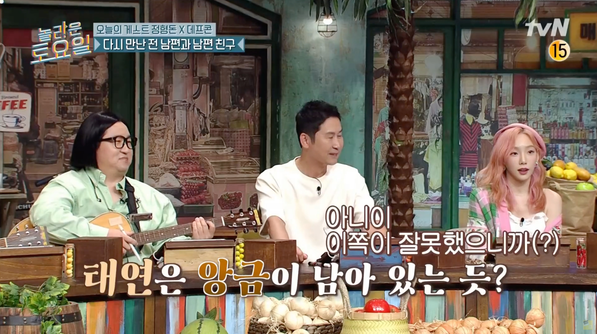 정형돈은 맞지 자기야? 라고 말하는 등 콘셉트를 유지했고 태연은 나 거론하지마. 누구세요? 라고 말해 모두를 폭소케 만들었습니다. 또 정형돈은 젤리를 믿어? 피오를 믿어?라는 데프콘의 질문에는 오케이 그럼 나 젤리. 나라도 전처 편을 들어줘야겠다라고 답하기도 하며 끈임없이 태연과의 과거에 집착하는 모습으로 꿀잼을 만들었습니다.