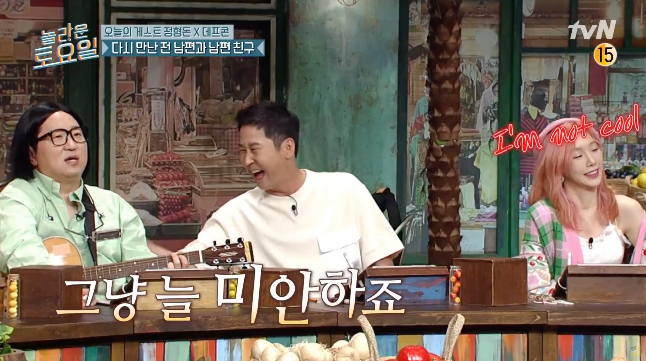 소녀시대 태연과 정형돈이 우결(우리결혼했어요) 이후 12년 만에 방송에서 재회 했습니다. 7월 10일 방송되는 tvN 놀라운 토요일 168회에는 정형돈과 데프콘의 출연하는데요. 랩으로 국힙 평정 완료 하고 포크로 해외 진출을 노리는 감성파 K듀오 잭&드미츄리 정형돈 데프콘이 출연합니다.