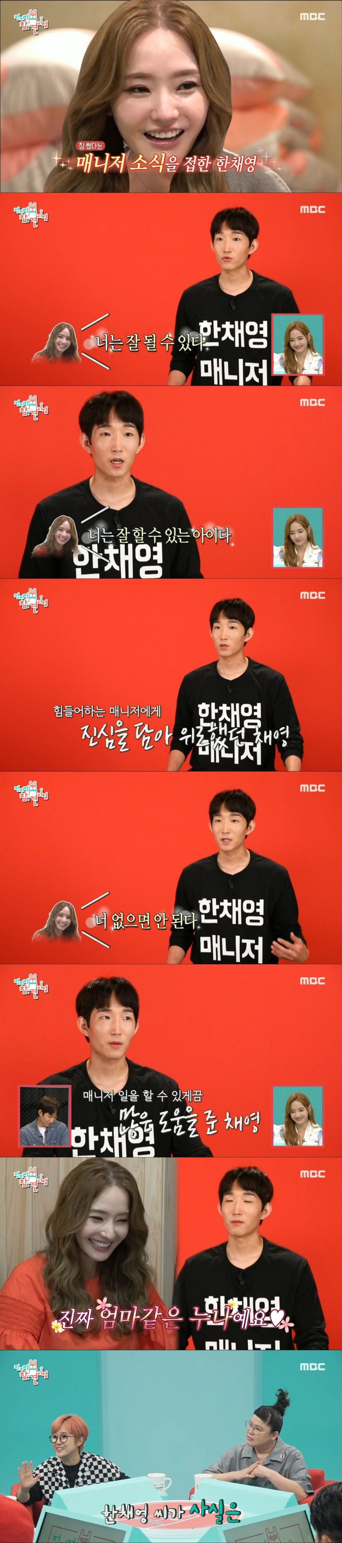 한채영은 매니저 집이 대구다. 저도 미국에서 홀로 떠나와 활동하다 보니까 부모님 없이 혼자 있다는 게 힘든 걸 잘 알고 하고 싶은 일이 있지만 여건이 부족했던 상황이라 그 마음을 알아서 해주게 됐다며 쑥스러워했는데요. 그러면서 한채영은 그런 걸 해주는 걸 떠나 참 잘한다. 사실 우리 일을 하다 보면, 누가 내 편이고 아닌지 모를 때가 있는데 매니저는 정말 내 가족처럼 내 편인 것 같다라고 애정을 드러냈습니다.