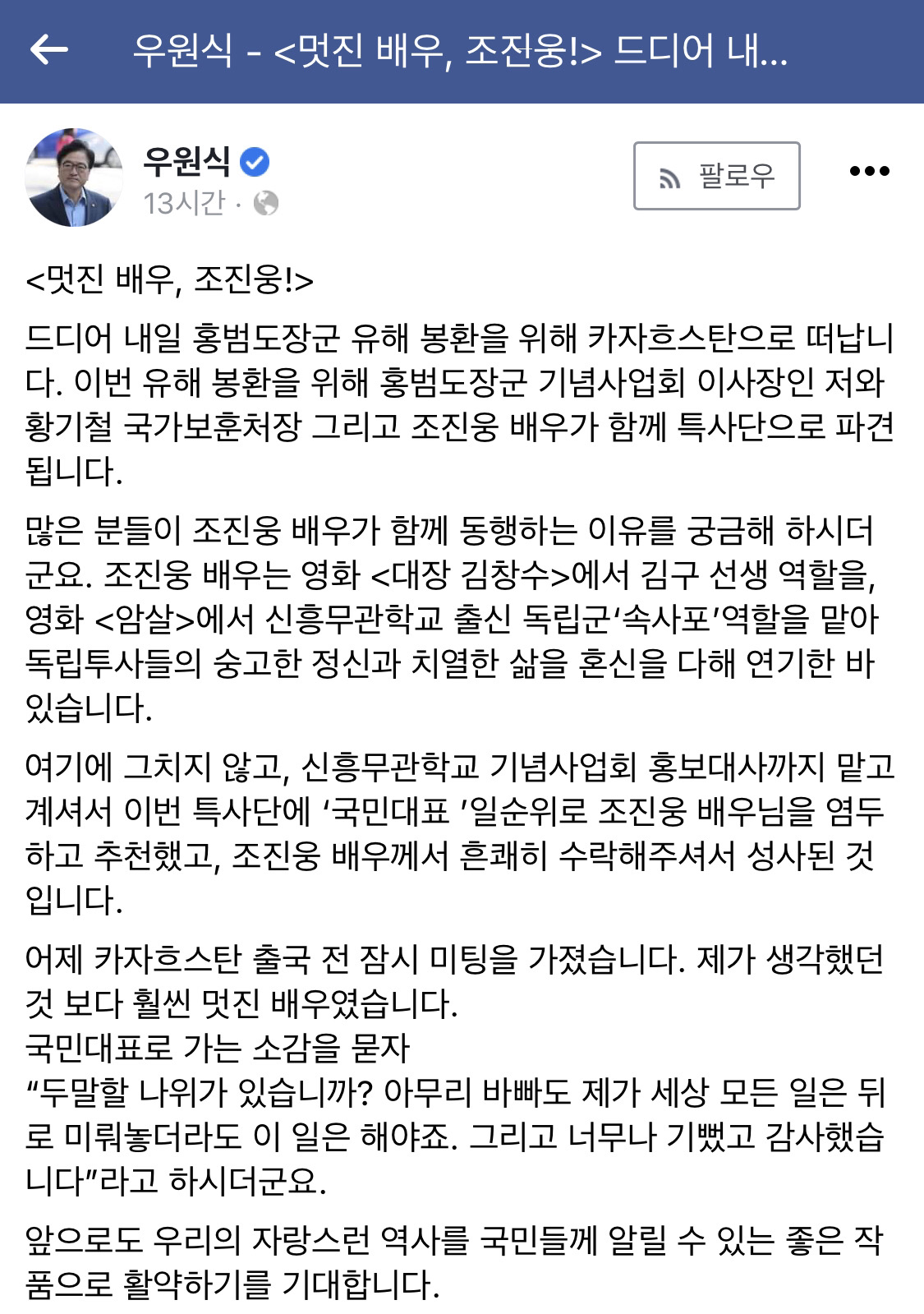 우원식 의원은 조진웅과 대담하는 모습이 담긴 사진을 올렸는데요. 우원식 의원은 어제 카자흐스탄 출국 전 잠시 미팅을 가졌다면서 조진웅은 제가 생각하는 것보다 훨씬 멋진 배우였다. 국민대표로 가는 소감을 묻자 두말할 나위가 있겠냐. 아무리 바빠도 제가 세상 모든 일은 뒤로 미뤄놓더라도 이 일은 해야 한다. 너무나 기뻤고 감사했다 라고 하는데요. 정말 멋진 사람 이네요.