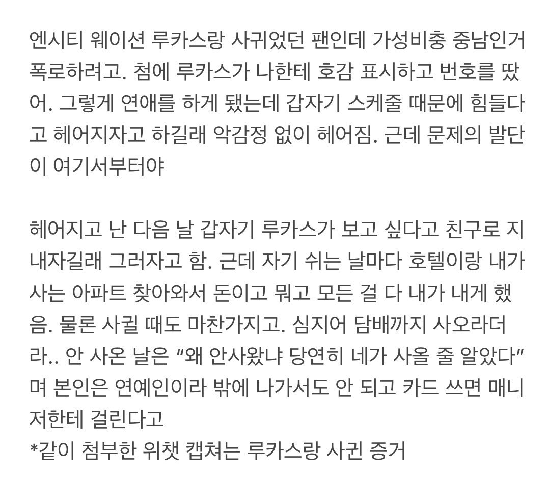 최근 루카스가 중국 갔을 때도 계속 이런식으로 연락하다가 한 달 전쯤 괘씸해서 내가 고소하겠다고 하니까 다음 날 바로 카카오톡 탈퇴하고 번호도 바꿨다며 X뱀질 당하면서 사귀었는데 차라리 팬으로 남을 걸 후회한다 가성비 중남 이다 라면서 글을 마무리 했습니다.