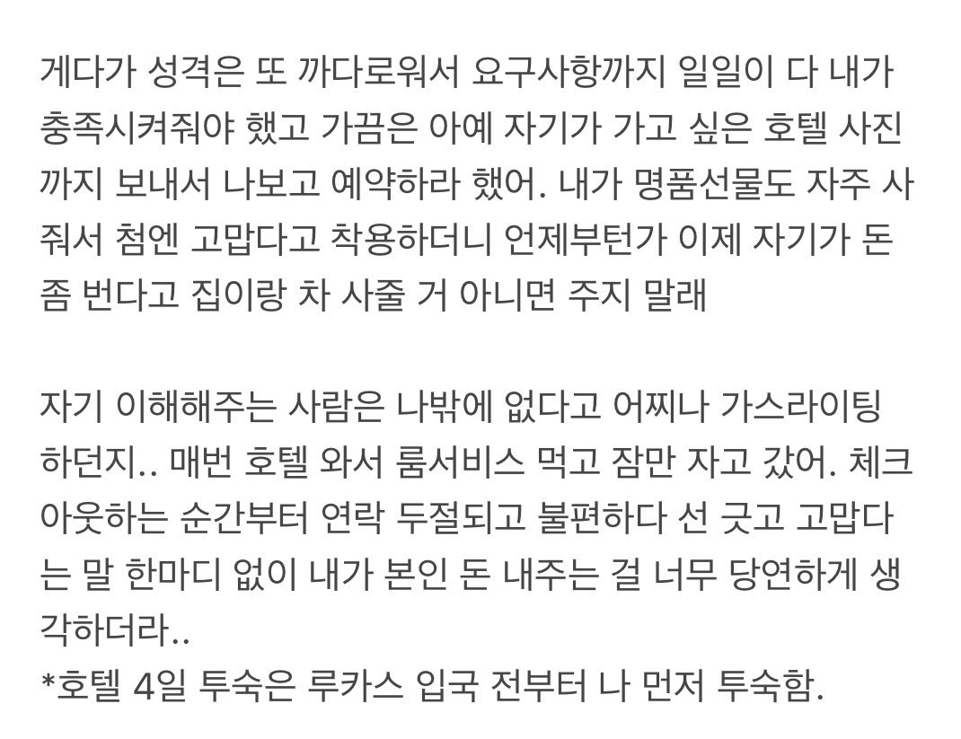 어떤날는 루카스가 자신이 가고 싶은 호텔 사진 보내면서 나보고 예약하라고 했고 매번 호텔 와서 룸서비스 먹고 잠만 자고 갔다. 체크아웃하는 순간부터는 연락 두절되고, 이후에는 불편하다 선 긋고 고맙다는 말 한마디 없이 내가 돈 내주는 걸 너무 당연하게 생각했다고 주장했습니다.