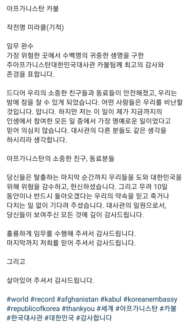 아프가니스탄의 소중한 친구, 동료분들 당신들은 탈출하는 마지막 순간까지 우리들을 도와 대한민국을 위해 위험을 감수하고, 헌신하셨습니다. 그리고 무려 10일 동안이나 반드시 돌아오겠다는 우리의 약속을 믿고 죽거나 다치는 일 없이 기다려 주셨습니다. 대사관의 일원으로서,