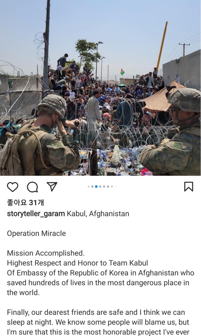 가장 위험한 곳에서 수백명의 귀중한 생명을 구한 주 아프가니스탄대한민국대사관 카불팀께 최고의 감사와존경을 표합니다.