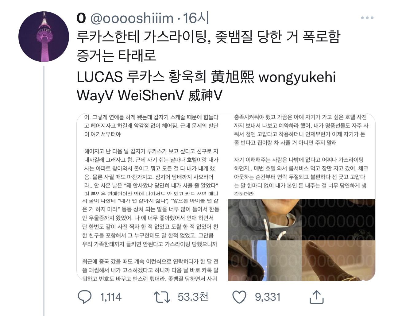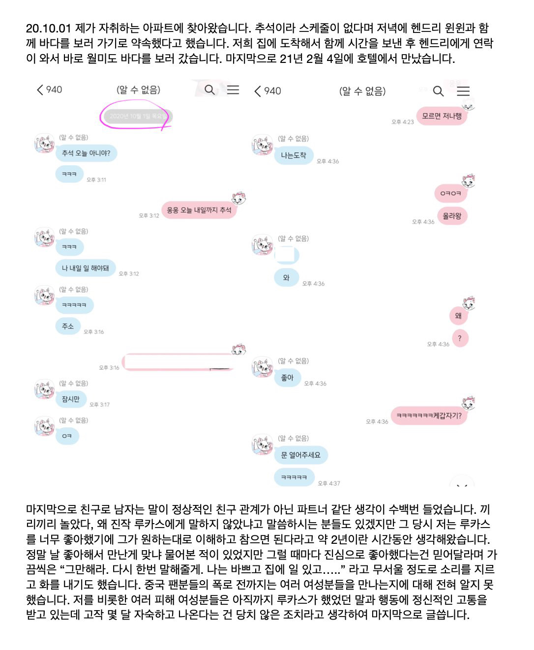 정말 날 좋아해서 만난게맞냐 물어본적이있었지만 그럴때마다진심으로 좋아했다는건 믿어달라며 가끔씩은그만해라.다시한번말해줄게.나는바쁘고 집에일있고 라고무서울정도로 소리를 지르고 화를 내기도했습니다. 중국팬분들의 폭로전까지는 여러여성분들을 만나는지에 대해전혀알지못했습니다. 저를 비롯한 여러피해여성분들은 아직까지 루카스가 했었던말과 행동에 정신적인 고통을받고있는데 고작 몇달 자숙하고나온다는건 당치않은 조치라 고생각하여 마지막으로 글씁니다.