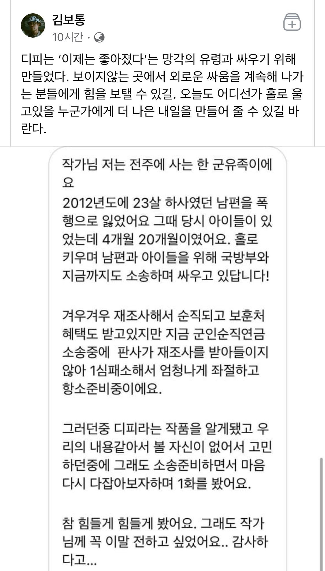 군 생활을 경험해 본 시청자들 중 일부는 트라우마를 떠올릴 정도로 신랄한 묘사로 보기가 힘들었다는 평이 있는데요. 군필 시청자 세대에 따라 다른 반응이 나오기도 했습니다. 디피의 배경은 2014년 강원도의 제103보병사단 헌병대. 스토리는 2000년대 디피로 활동한 김 작가의 경험과 극 중 주요 모티브가 된 김일병 사건(2005년) 등이 담겨 있는데요. 당시 군대를 다녀온 군필자들은 실제로는 더 심했다며 요즘 군대가 군대냐는 의견을 모았습니다.
