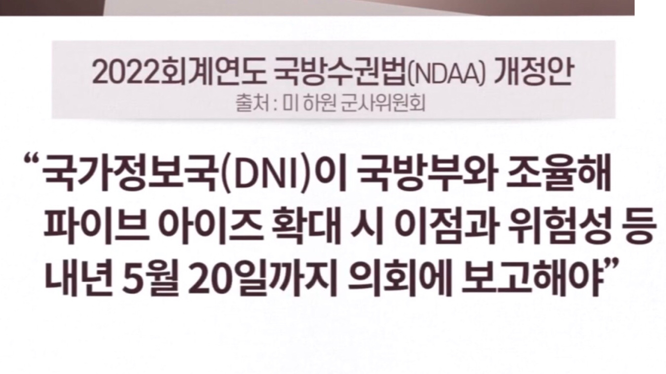 9월 1일(현지시간) 하원 군사위 산하 정보특수작전소위가 마련한 2022회계연도 국방수권법(NDAA) 개정안을 보면 위협의 지형이 파이브 아이즈 시작 이후 광범위하게 변했음을 인식한다 며 기밀정보 공유 동맹국을 늘려야 한다고 밝히고 있습니다. 중국과 러시아를 주된 위협으로 지목한 뒤 정보 공유를 할 민주주의 국가로 한국을 가장 먼저 선택했습니다. 이어 일본, 인도, 독일을 언급했으며, 개정안은 국가정보국(DNI)이 국방부와 조율해 확대 시 이점과 위험성, 각국이 기여할 수 있는 부분 등에 대한 검토 내용을 내년 5월 20일까지 의회에 보고하도록 했습니다.